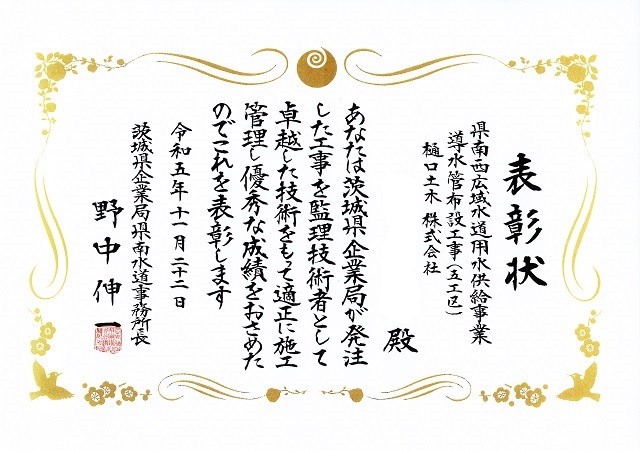 【令和5年度 茨城県企業局主任(監理)技術者】 工事名令和5年11月22日 令和5年度茨城県企業局主任(監理)技術者表彰を受賞しました 関連画像 シェアする お知らせ前の記事【令和5年度~チャレンジいばらき~知事表彰建設業者・知事表彰主任(監理)技術者】2023年10月31日 施工例次の記事04国補地道第04-03-008-0-001号箱型函渠工事2024年2月28日