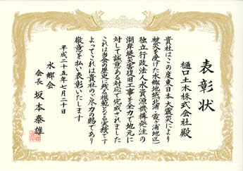 その他、樋口土木は確かな技術と企業努力で数々の表彰をいただいております。ほんの一部ではございますが以下にご紹介させていただきます。